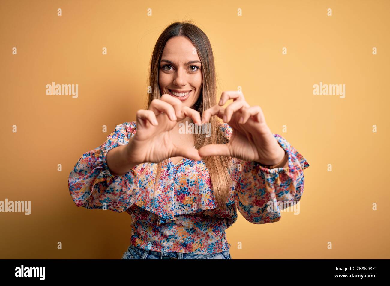 Jeune femme blonde aux yeux bleus portant des vêtements d été sur fond jaune souriant dans l is a popular picture for sexy and hot.
