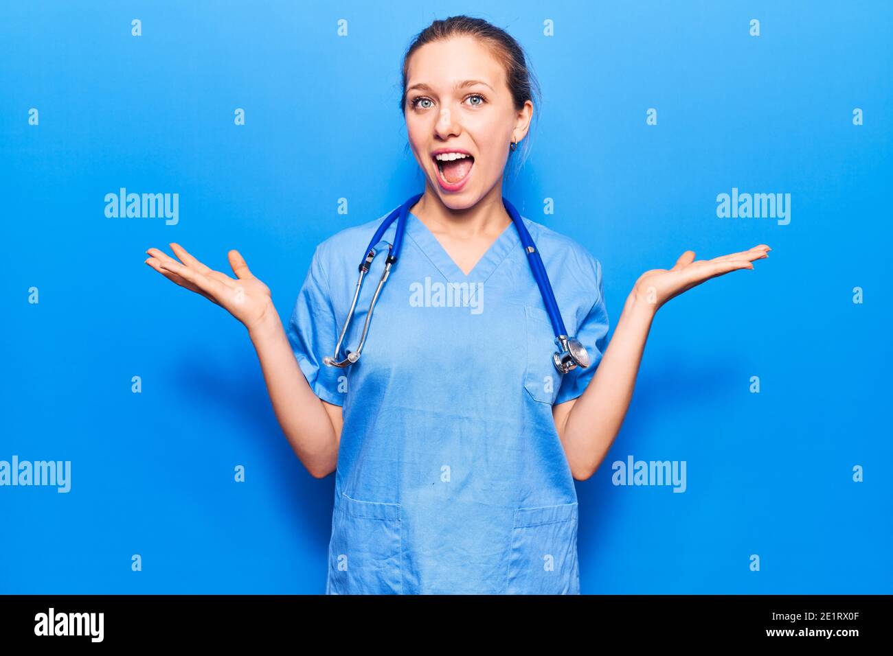 Jeune femme blonde portant un uniforme de médecin et un stéthoscope célébrant la victoire avec is a popular picture for sexy and hot.