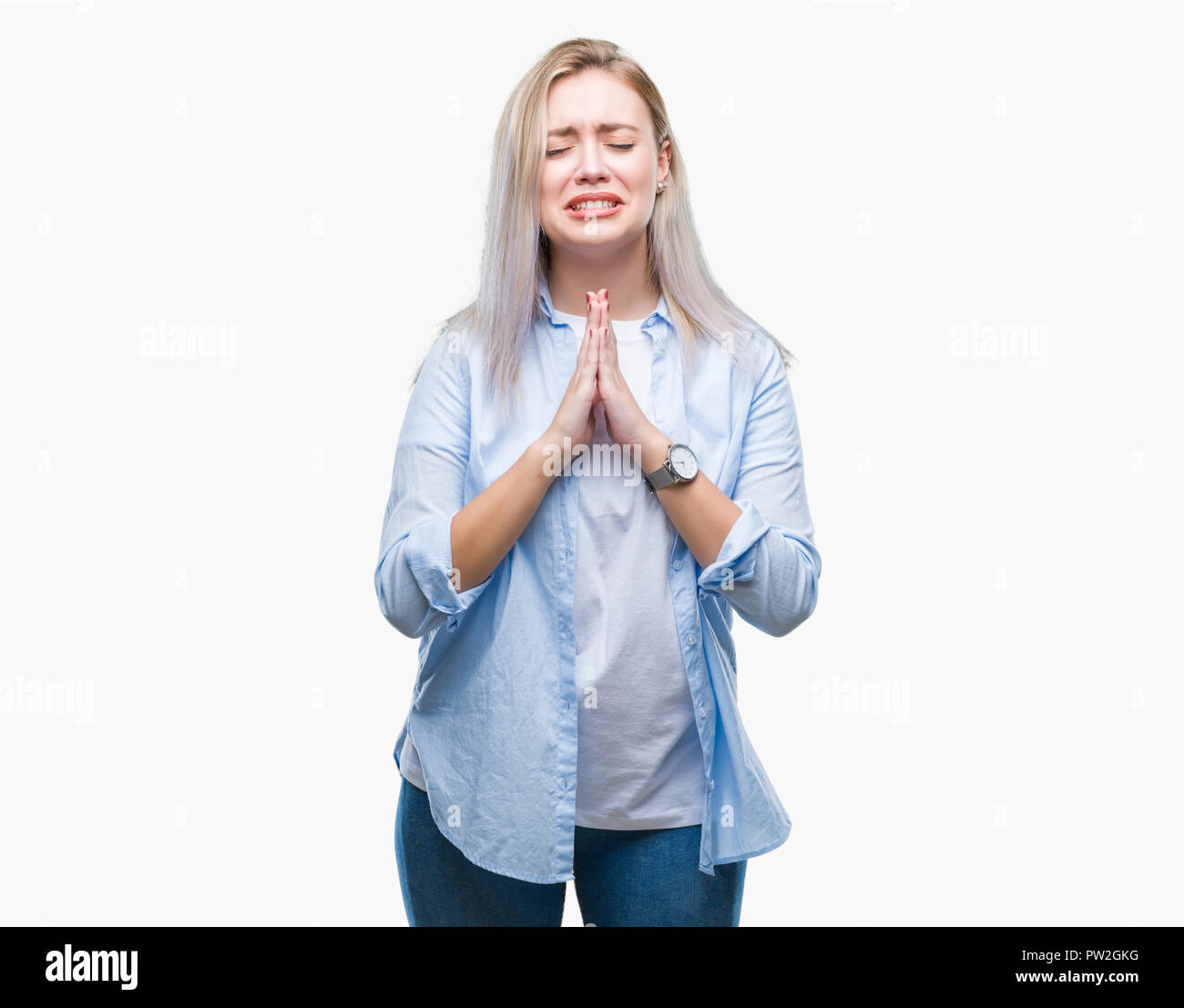 Tag : Junge blonde Frau über isolierte Hintergrund betteln und mit Händen gemeinsam beten mit der