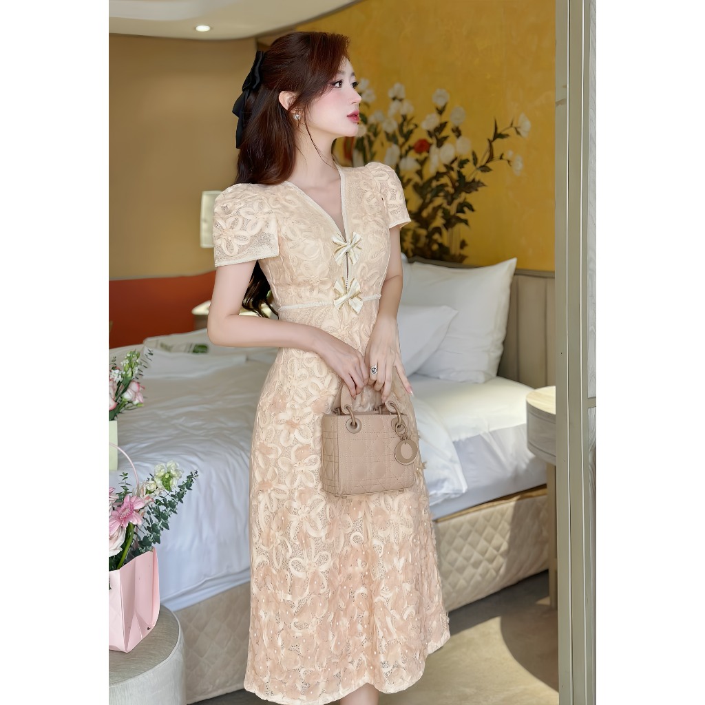 Khâu váy thiết kế ren nude nơ sang chảnh phù hợp đi làm đi chơi Shopee Việt Nam