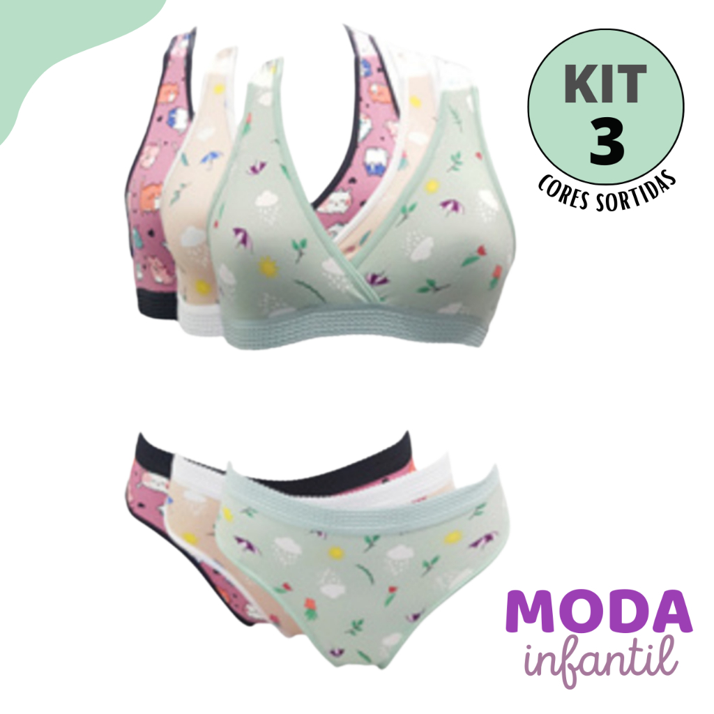 Kit 3 Conjuntinho Lingerie Amanda Infantil Calcinha Sutiã Nadador Confortável Juvenil Menina