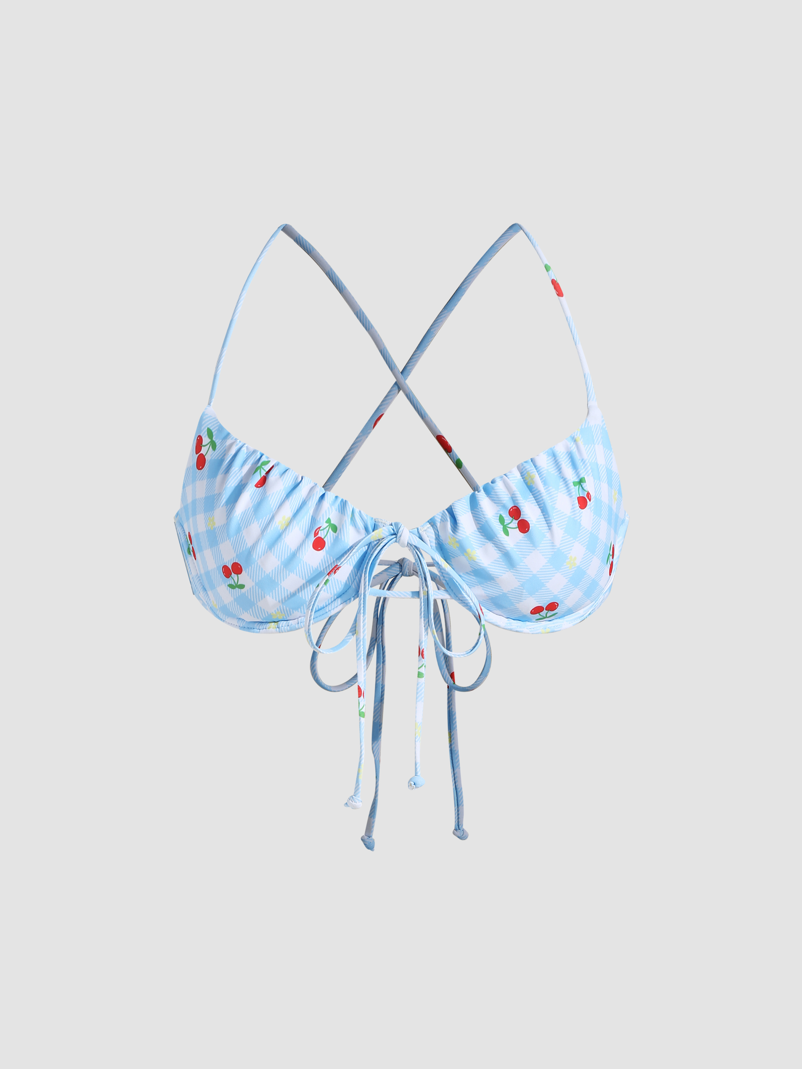 Tag : Knit Fabric Check Cherry Print Criss Cross Underwire Uplifting Bikini Top For Beach Vacation
