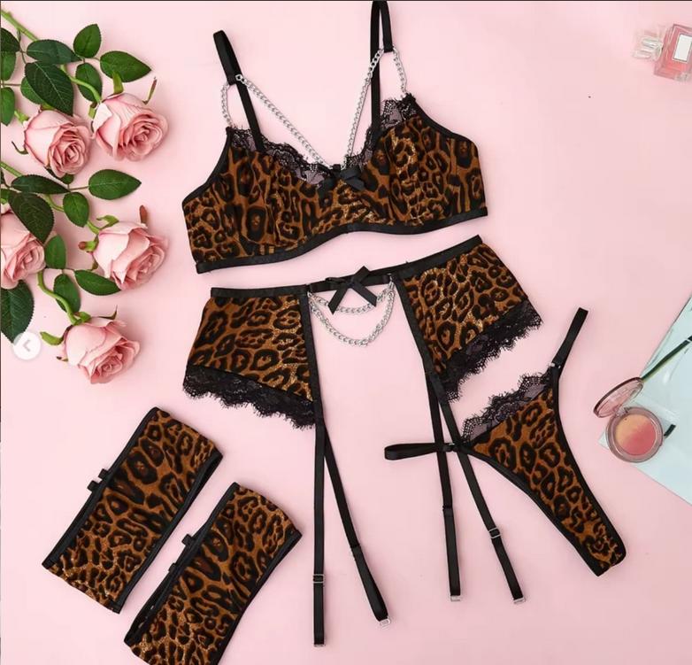 Leopard Lingerie Set 4 Piece Lingerie Set Erotic Lingerie Set Romantic Lingerie Garter is a popular picture for sexy and hot.