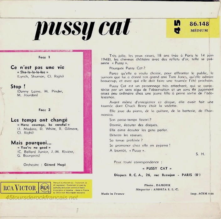 Tag : Les EPs français PUSSY CAT 1966 FR RCA VICTOR 86 148 Ce n est pas une vie mono
