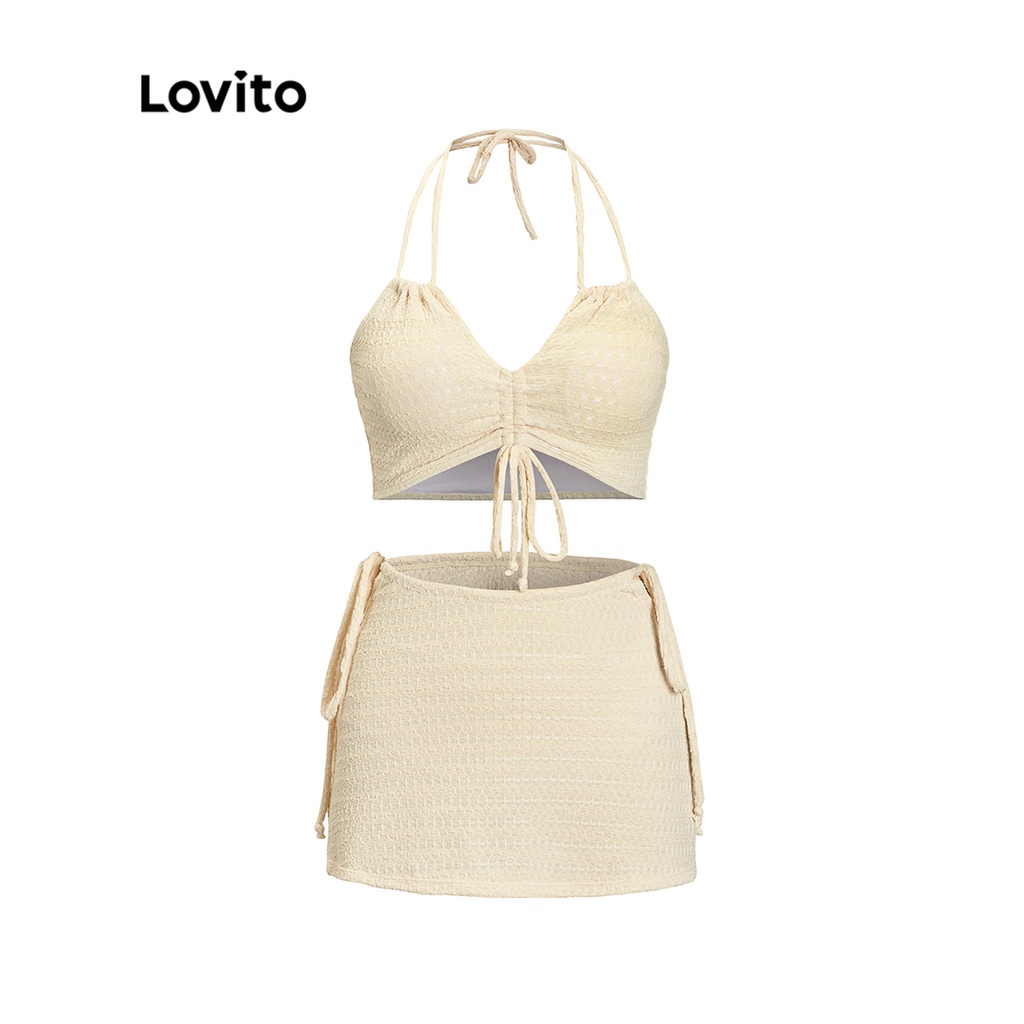 Tag : Lovito Casual Plain Drawstring Lace Up Textured Fabric Shirring Bikini Set For Women L50AD003