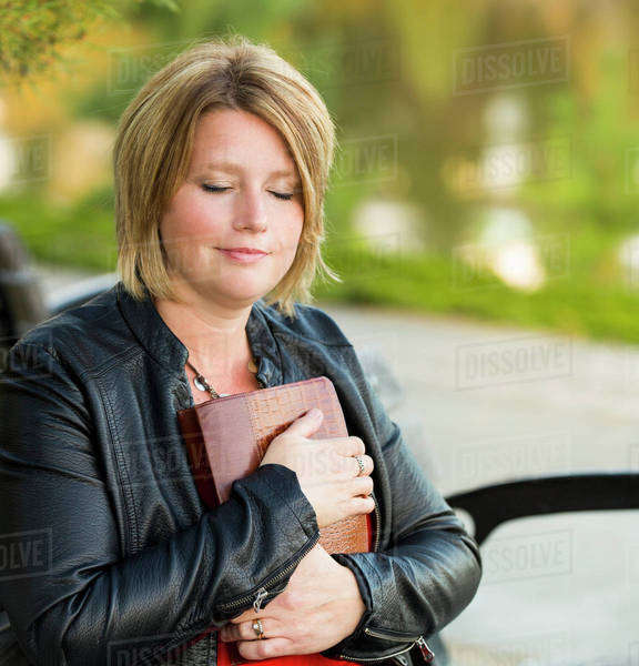 Mature Christian Woman Embracing Her Bible In A City Park Setting Beside A Lake In Autumn is a popular picture for sexy and hot.