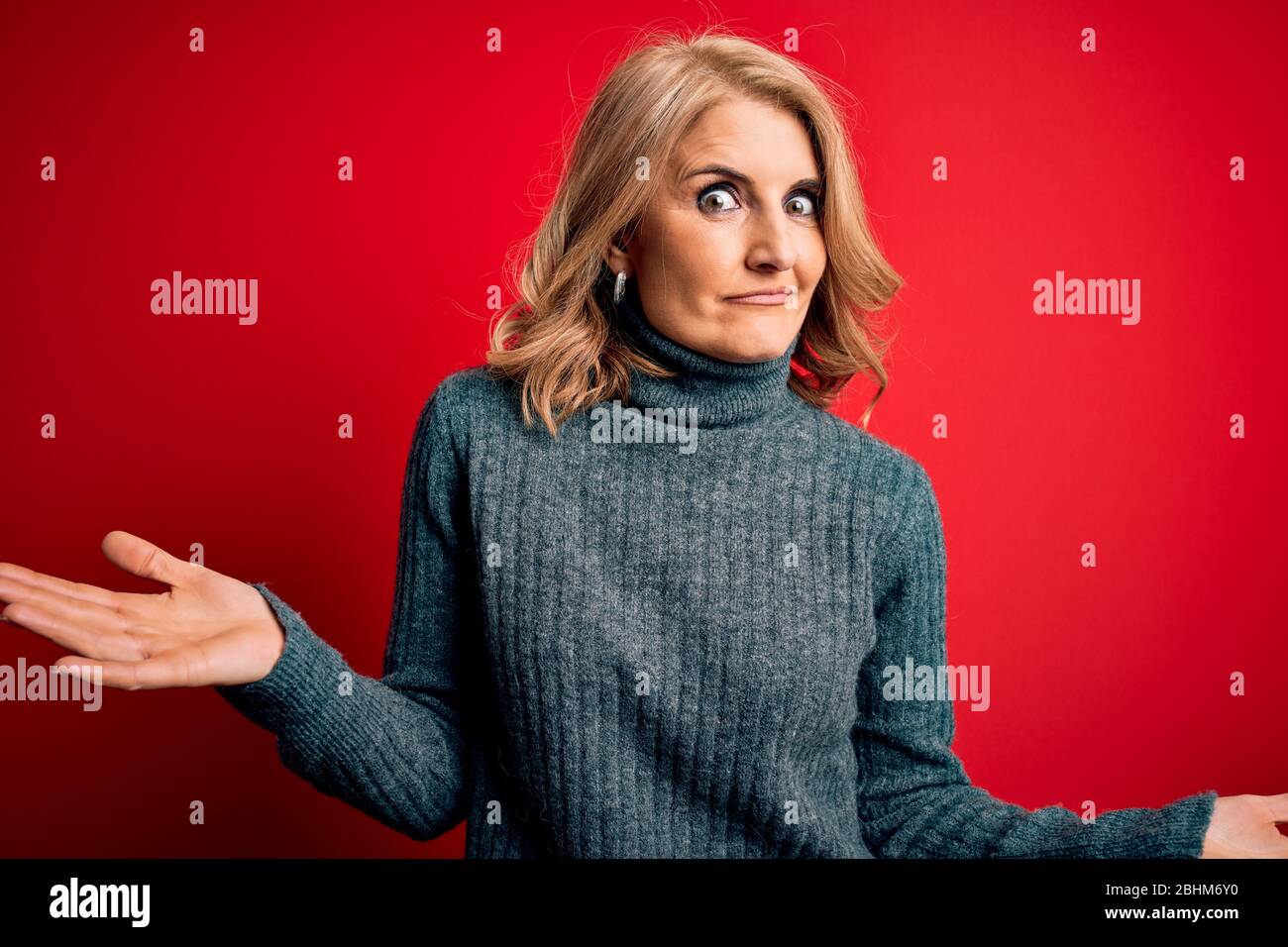 Middle Age Beautiful Blonde Woman Wearing Casual Turtleneck Sweater Over Red Background Clueless is a popular picture for sexy and hot.