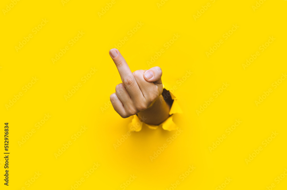 Tag : Middle Finger Of Left Hand Insulting Gesture Torn Hole In Yellow Paper Fuck You Concept