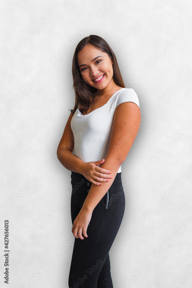 Modelo Latina De Pelo Largo Con Fondo Blanco Vistiendo Blanco Y Negro Stock Photo Adobe Stock