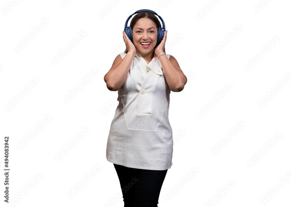 Tag : Mujer latina escuchando música en audifonos en fondo blanco Stock Photo Adobe Stock