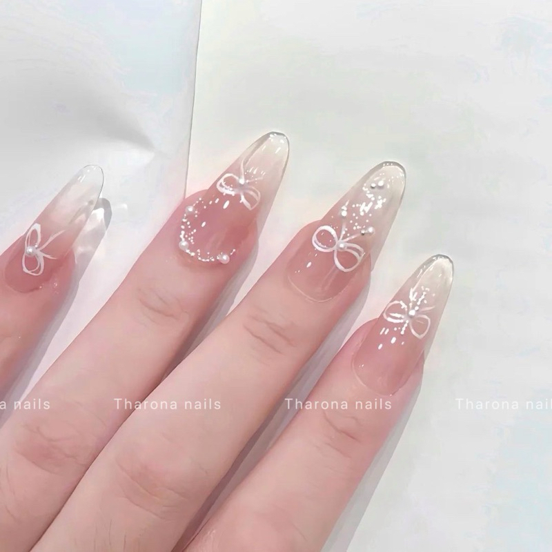 Nailbox thiết kế A018 mẫu nail ombre thạch nude vẽ nơ đính ngọc trai Shopee Việt Nam