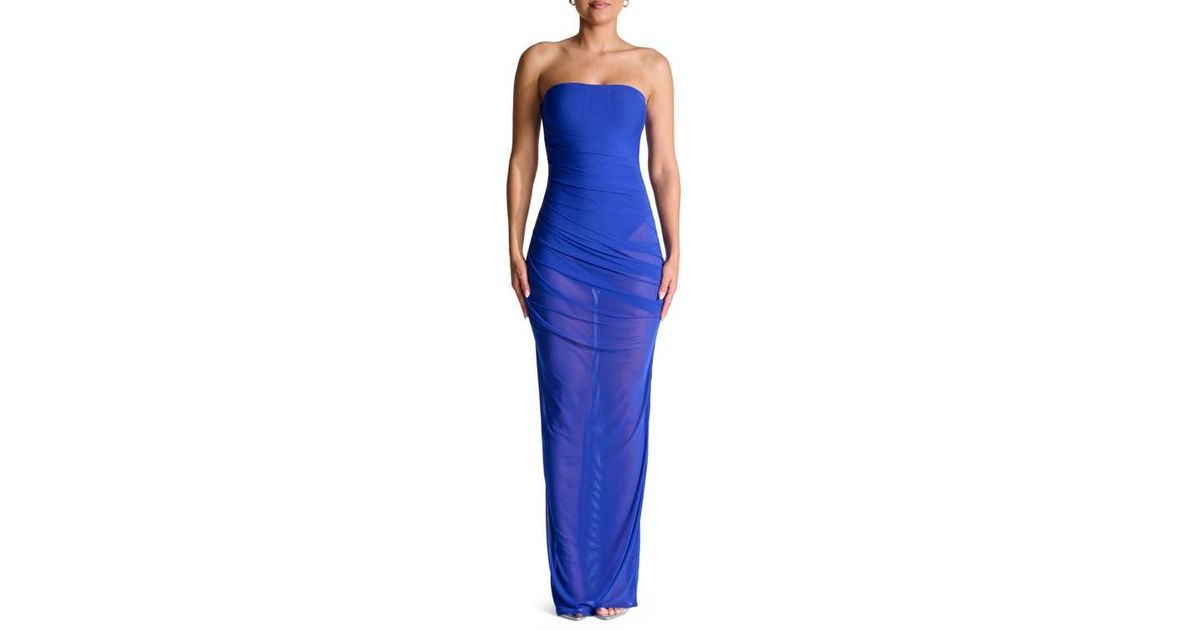 Tag : Naked Wardrobe Strapless Shirred Sheer Mesh Body Con Dress In Blue Lyst