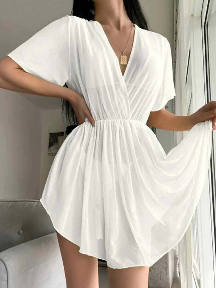 Tag : New Summer Women Mesh Sheer Bikini Cover Up Tunic Beach Dress Short Sleeve V Neck See