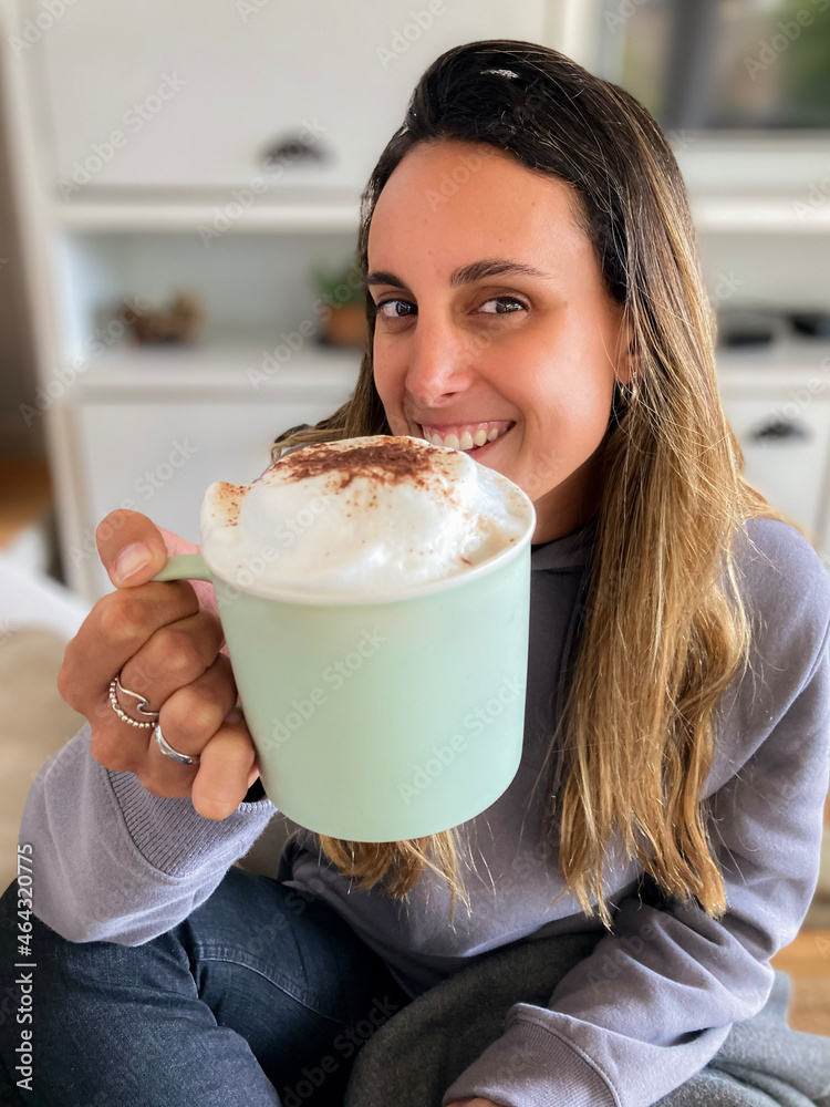 Niña latina tomando una taza de chocolate o café caliente y muy espumoso lleva poleron gris 352935