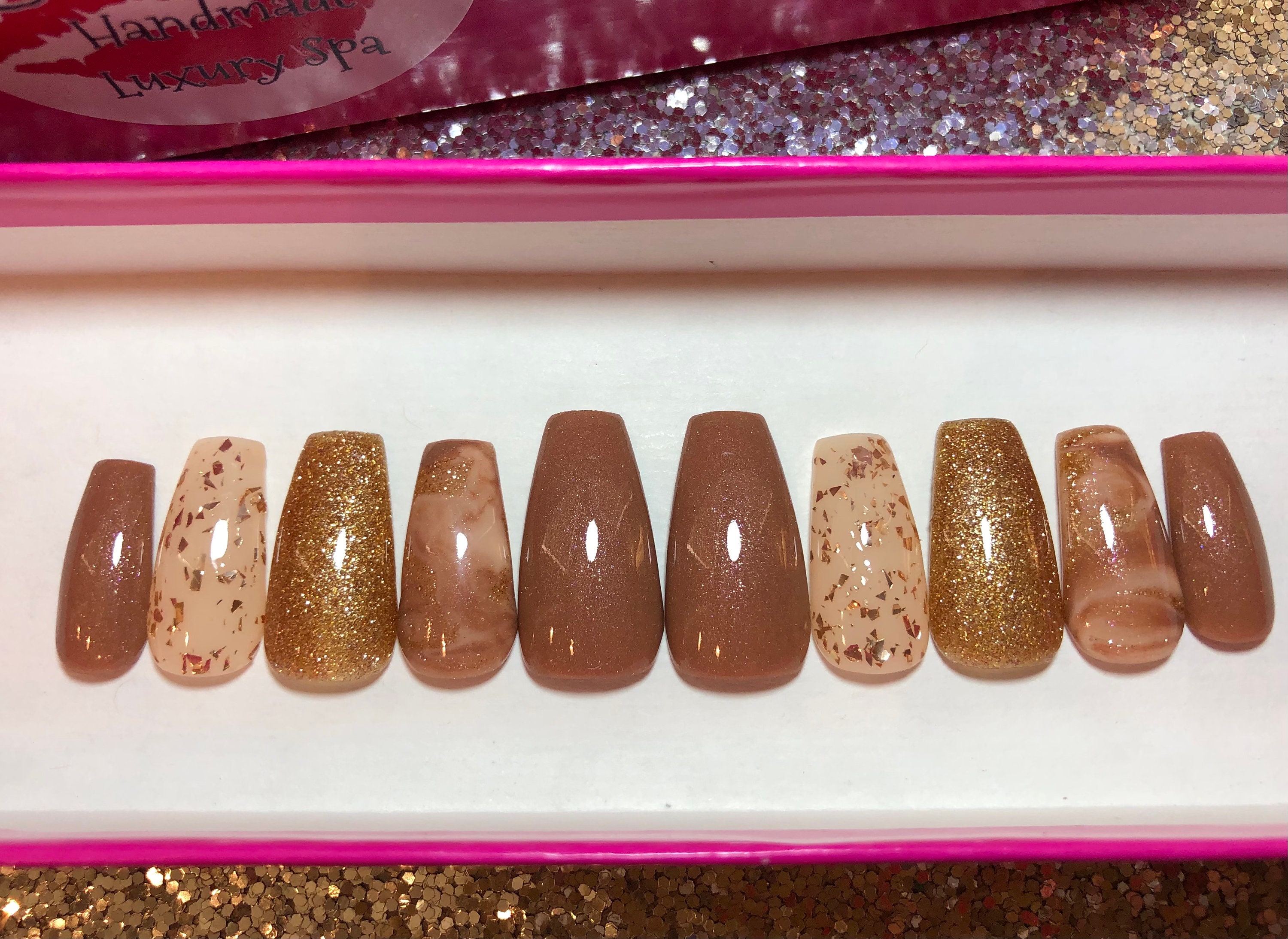 Tag : Nude Marble Gold Glitter Press On Nails Fake Fingernails Glue On Coffin Square Almond