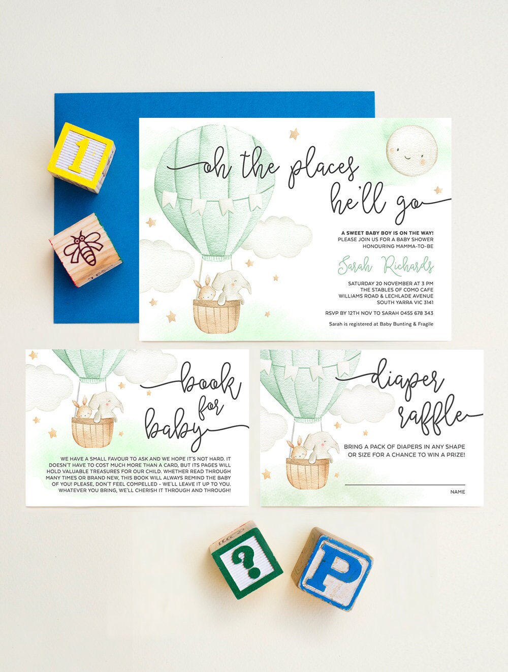 Tag : Oh The Places Up Up Away Hot Air Balloon Baby Shower Invitation Green Boy Girl Gender