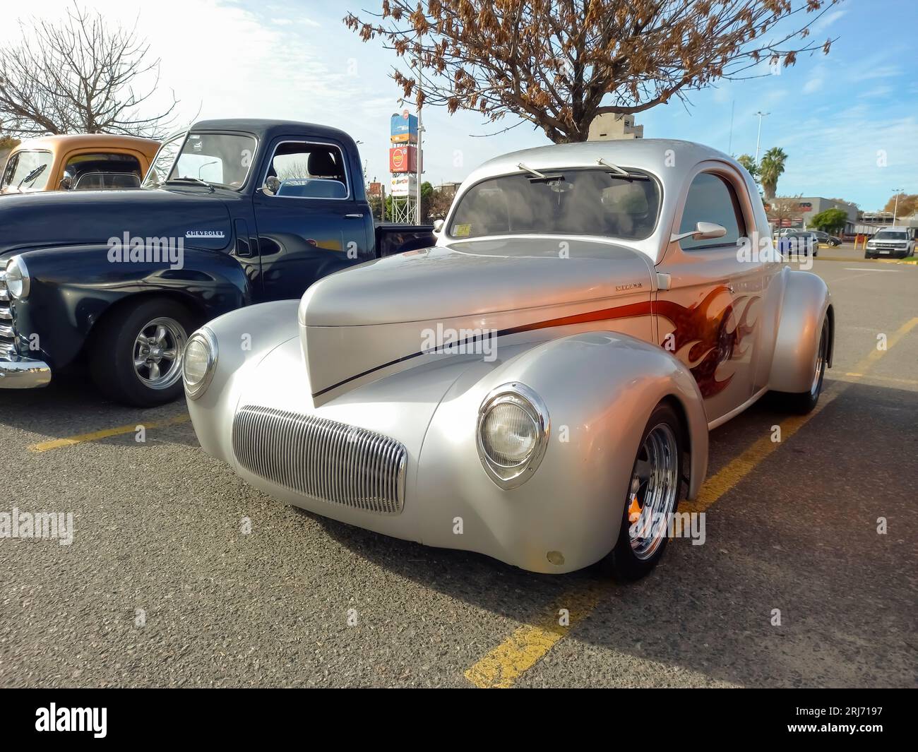 Tag : Old Gray Silver 1941 Willys Overland Americar Coupe Hot Rod Dragster In A Parking Lot Gasser
