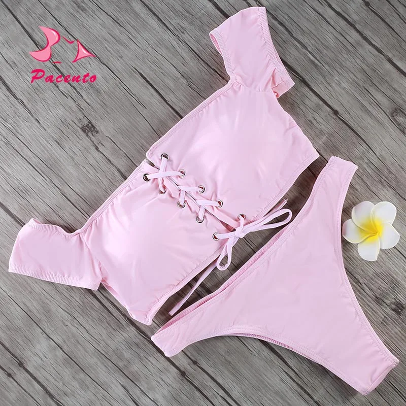 Pacento Off Shoulder Bikini Solid Bandage Swimwear Bandeau is a popular picture for sexy and hot.