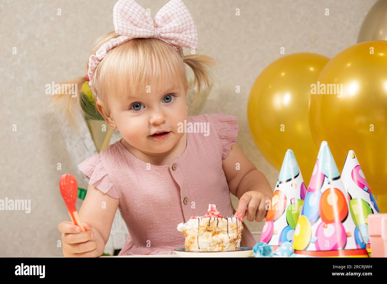 Petite fille blonde avec deux queues de cheval et un arc sur sa tête mangeant du gâteau avec une 264992