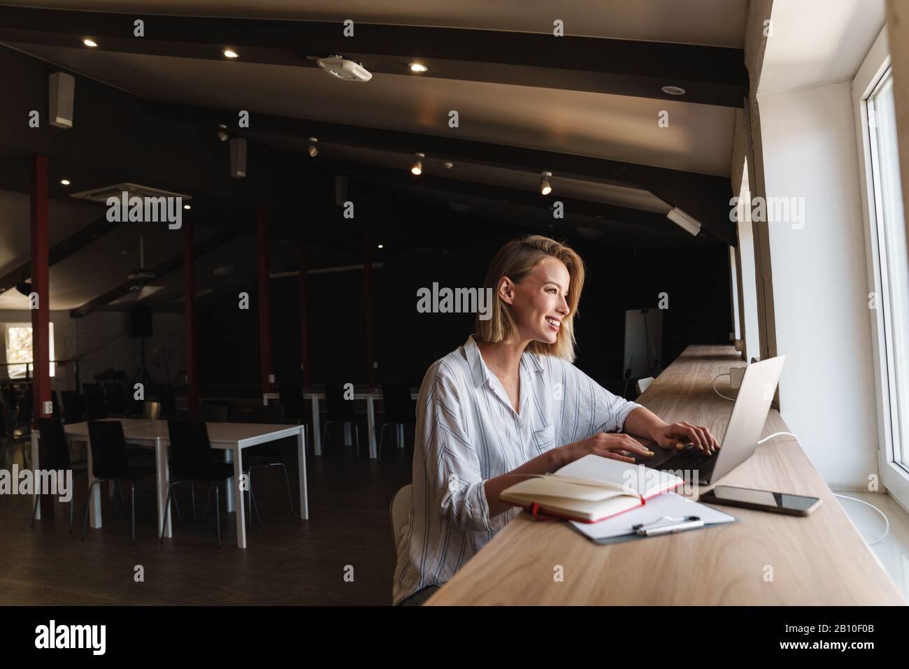 Tag : Photo D Une Femme Blonde Souriante Qui Tape Sur Un Ordinateur Portable