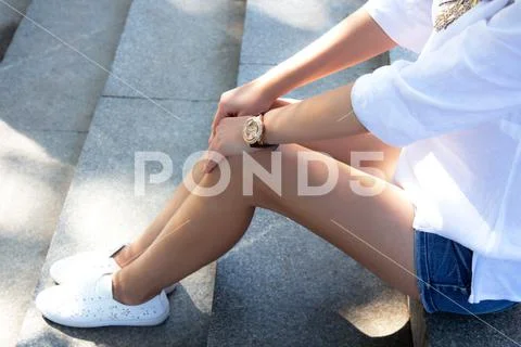 Photograph Girl With Slender Naked Tanned Legs Sitting On The Steps is a popular picture for sexy and hot.