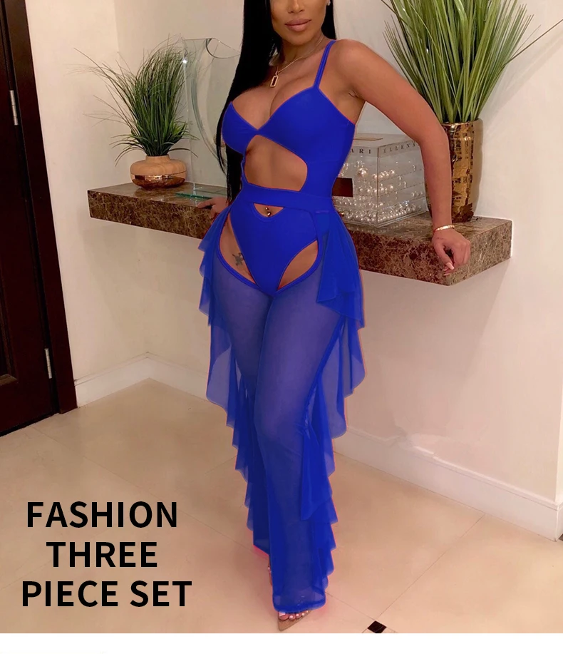 Plus Size Women Sheer Swim Suit Ruffle String Bikini Mesh Cut Out Cover Up High Waist One Piece 29830