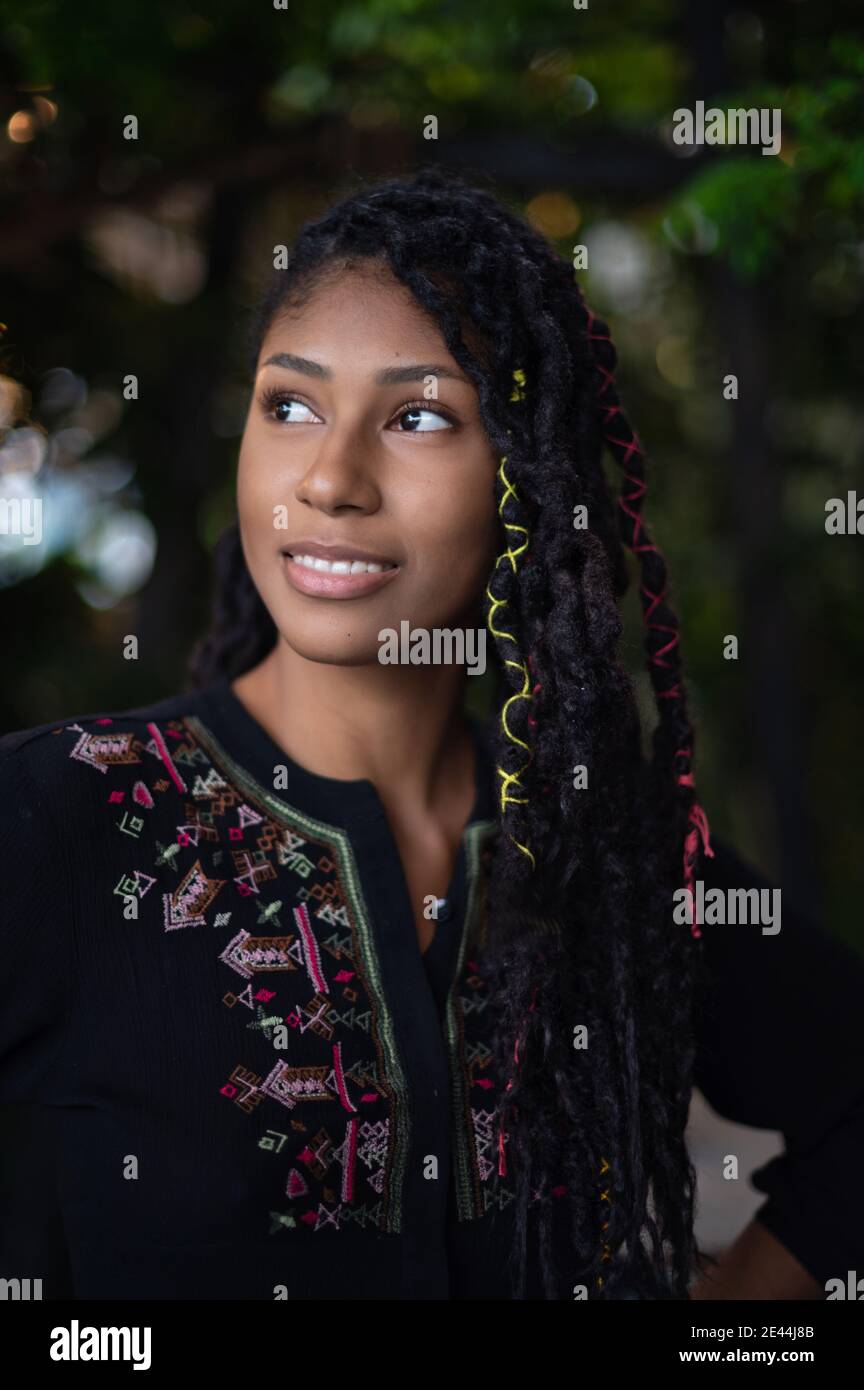 Tag : Portrait einer verträumten attraktiven afro latina Frau mit Dreadlocks nach oben schauen