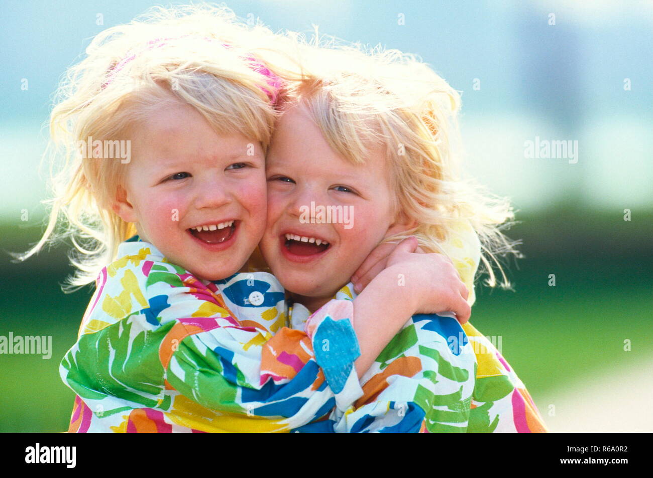 Tag : Portrait Lachendes Zwillingspaarin Bunten Jacken In Inniger Umarmung Blonde Maedchen
