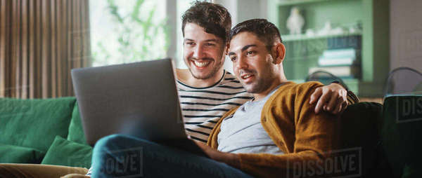 Tag : Portrait Of Gentle Gay Couple Using Laptop Computer While Sitting On A Couch In Cozy Stylish