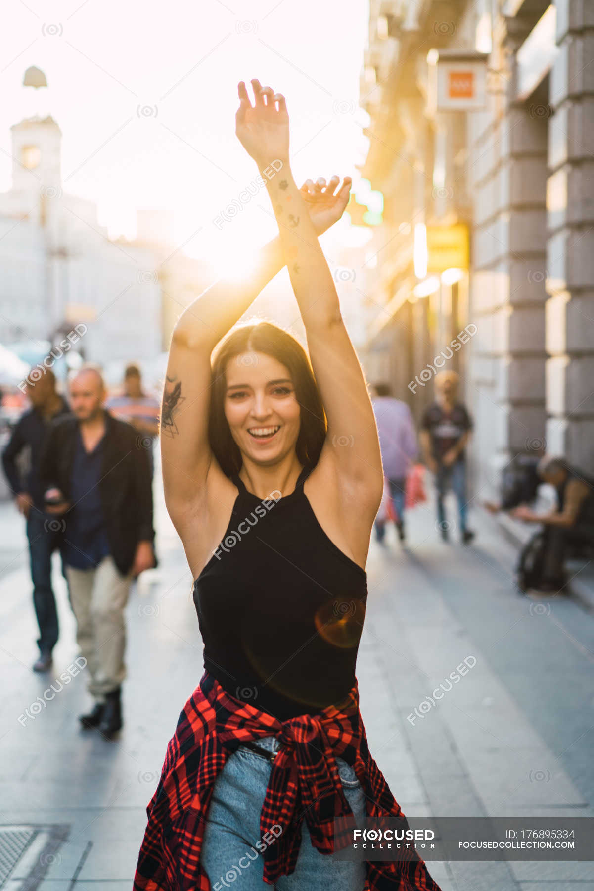 Portrait Of Stylish Brunette Holding Hands Up And Cheerfully Posing At Street In Sunlight pictures has 500 x 400 · 50 kB · jpeg.