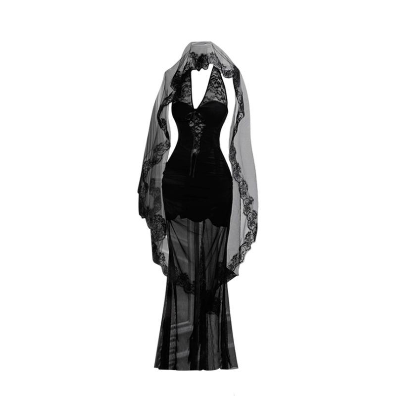 Real Shot Ready Stock Halter Neck Black Lace Dress Female Sexy Hot Girl Slim Fit Slimmer Look