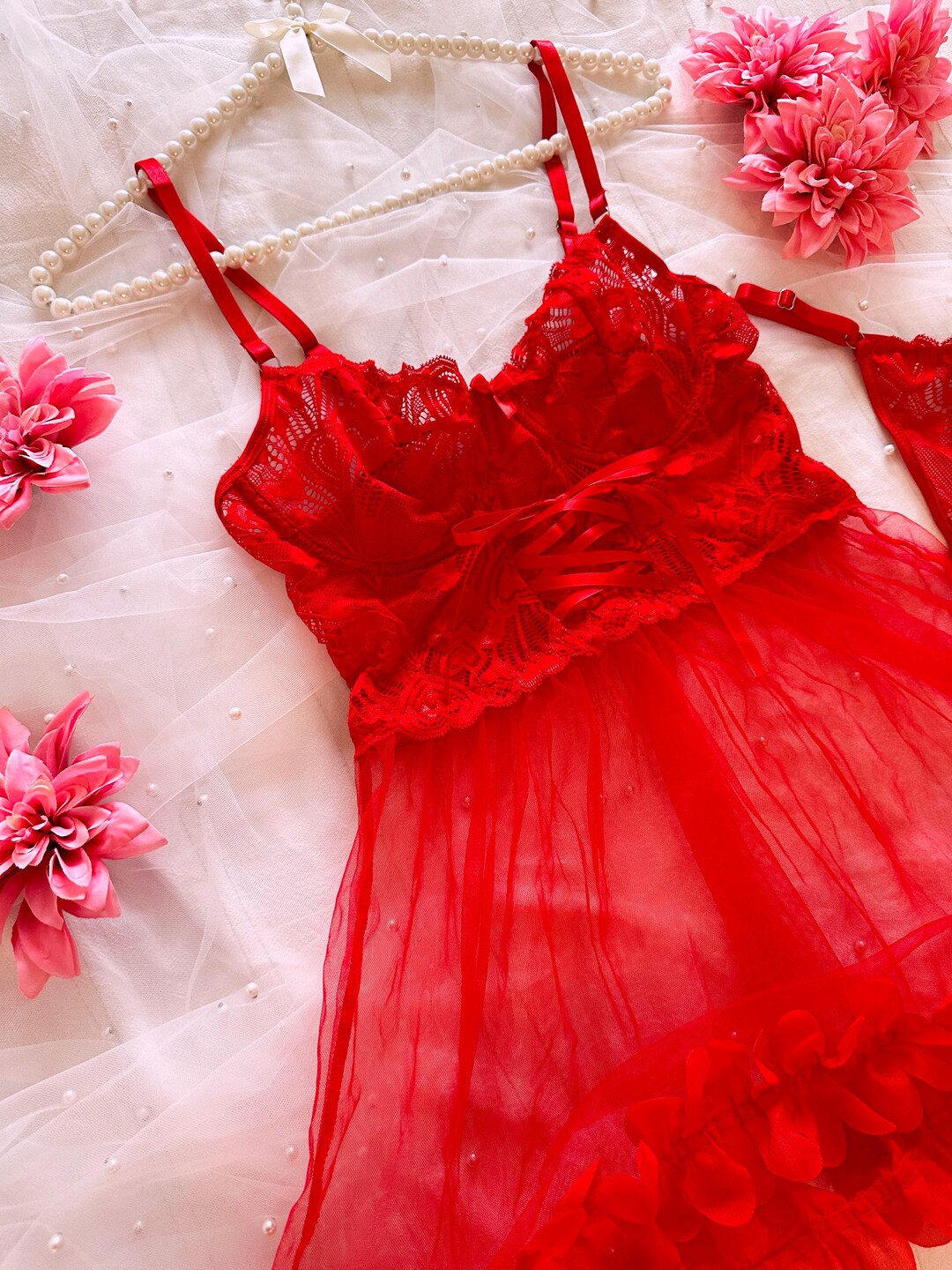 Red Lace Babydoll Lingerie Set With Thong Corset Lace Up Adjustable Straps For Valentine S is a popular picture for sexy and hot.