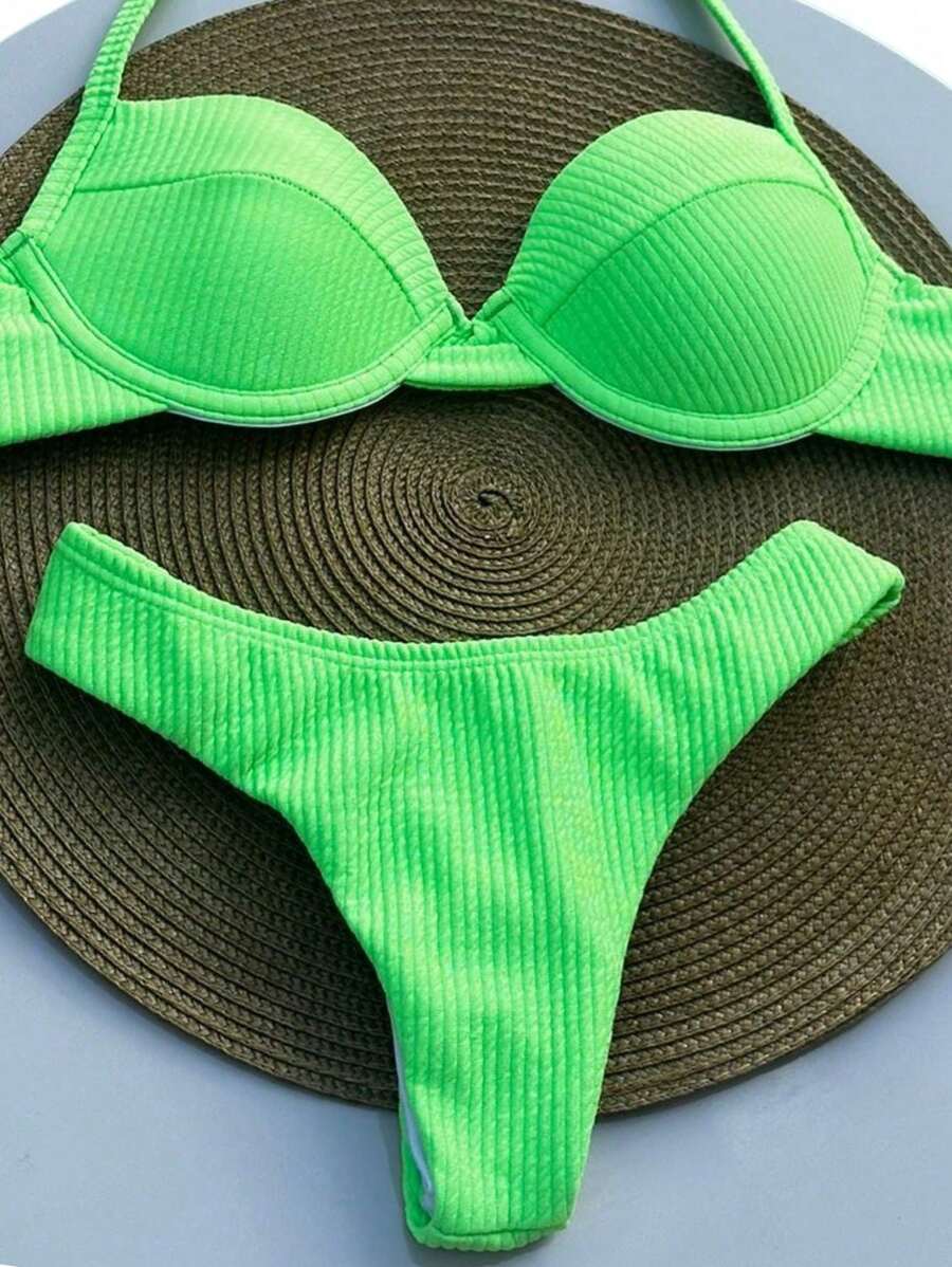 Retro Textured Ribbed Half Cup Bikini With Underwire Padded Panties Double Thong Semi Wire