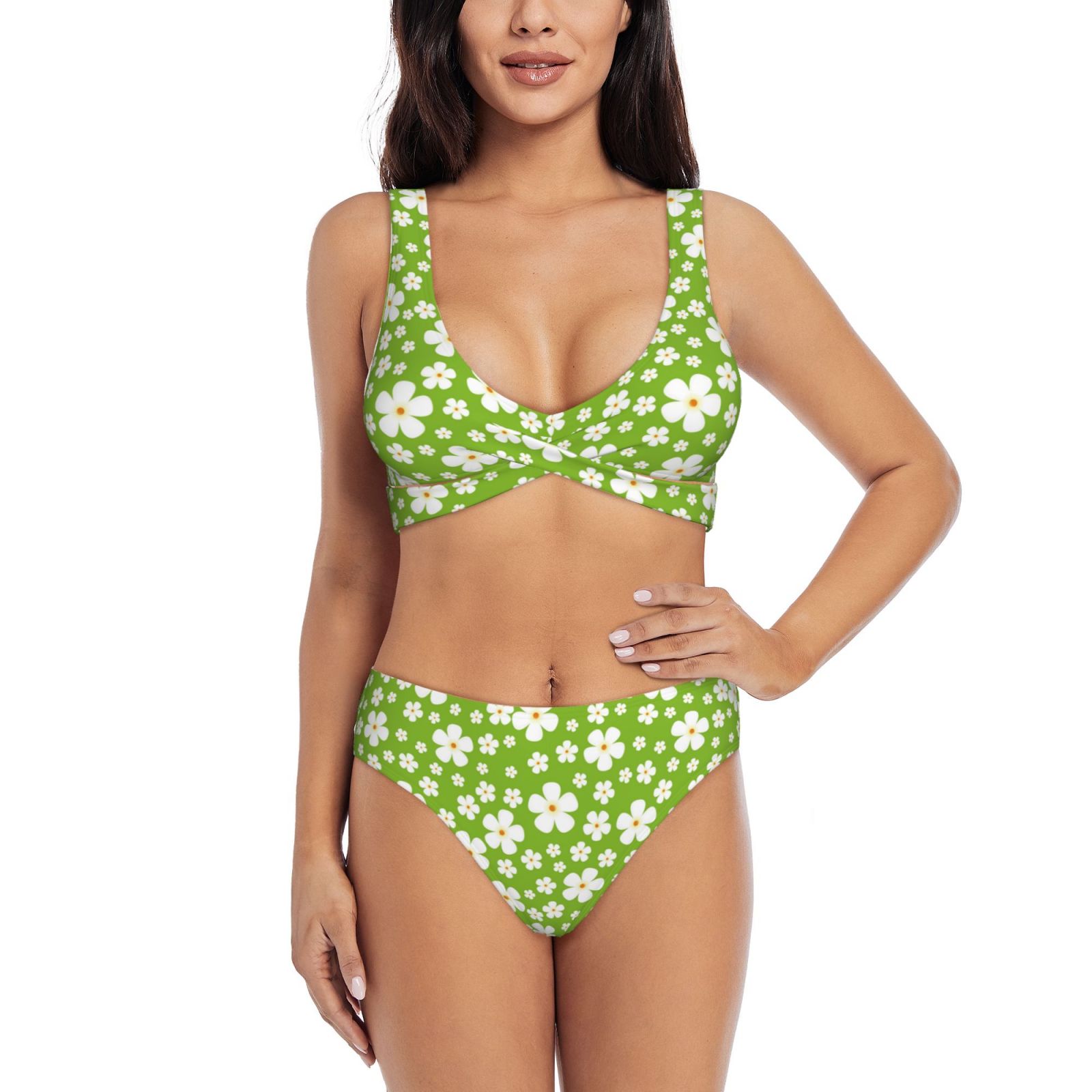 Rocae Green White Flowers For Bikini Set For Women Two Piece Sexy High Swimsuits Split Crossover is a popular picture for sexy and hot.