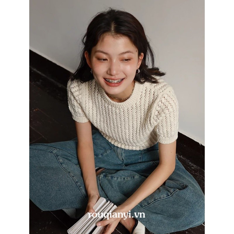 Ruoqianyi Mùa Hè Phong Cách Pháp Sang Trọng Rỗng Retro Thời Trang Hot Girl Loose Đan Áo Thun Nữ