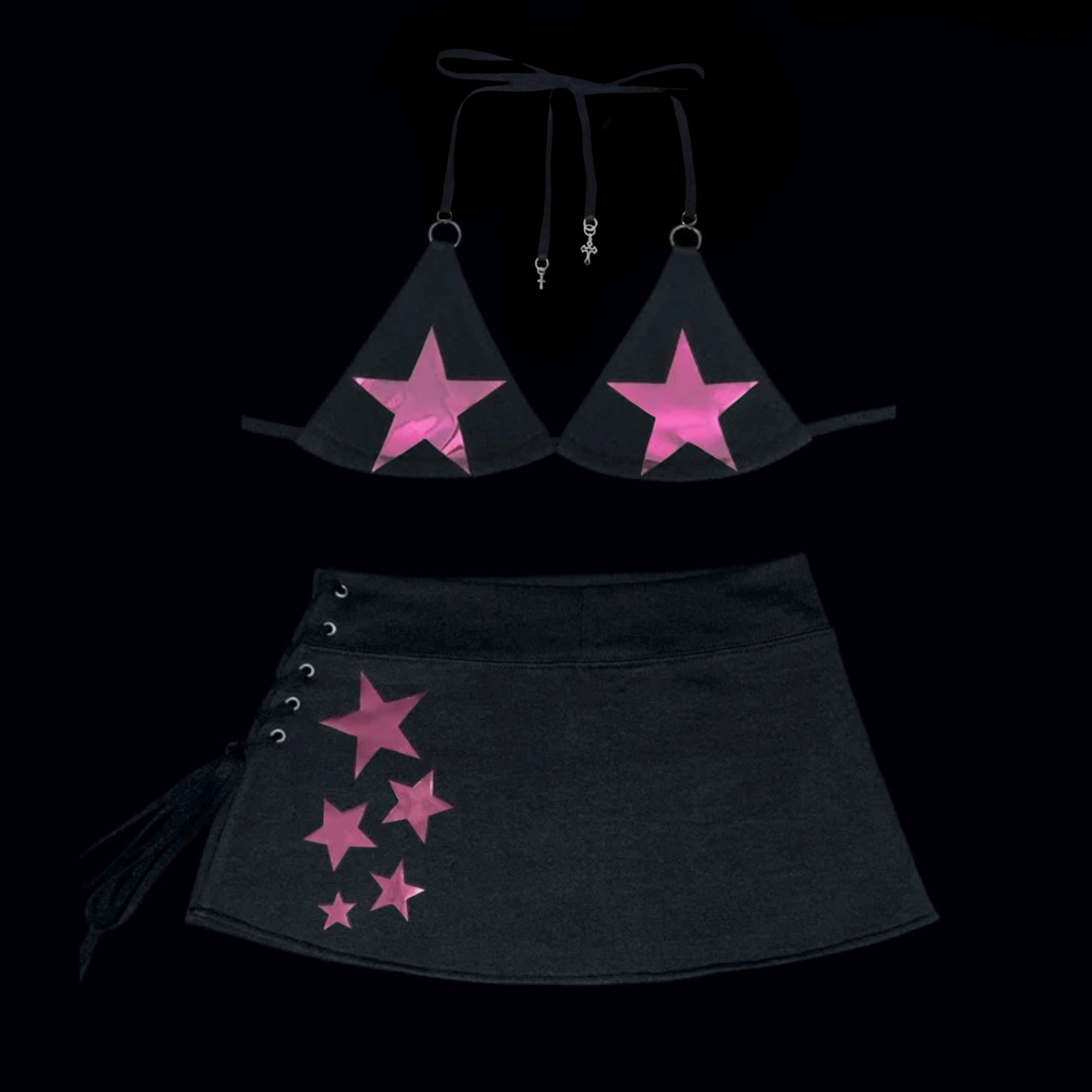 S๐ฑ๐๐ฏ Piece Set Handmade Y k Bikini Top Lace up Micro Mini Skirt W Pink Metallic Star Print is a popular picture for sexy and hot.