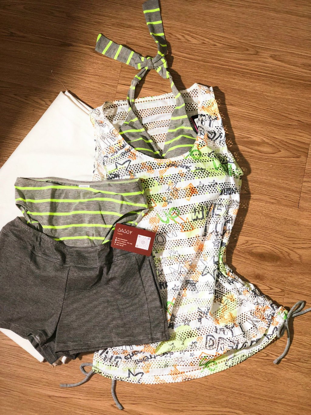 Related pictures for SET 4 MÓN Set bơi bikini sọc neon tròng cổ kèm bộ khoác lưới sát nách ngoài phong cách Hàn