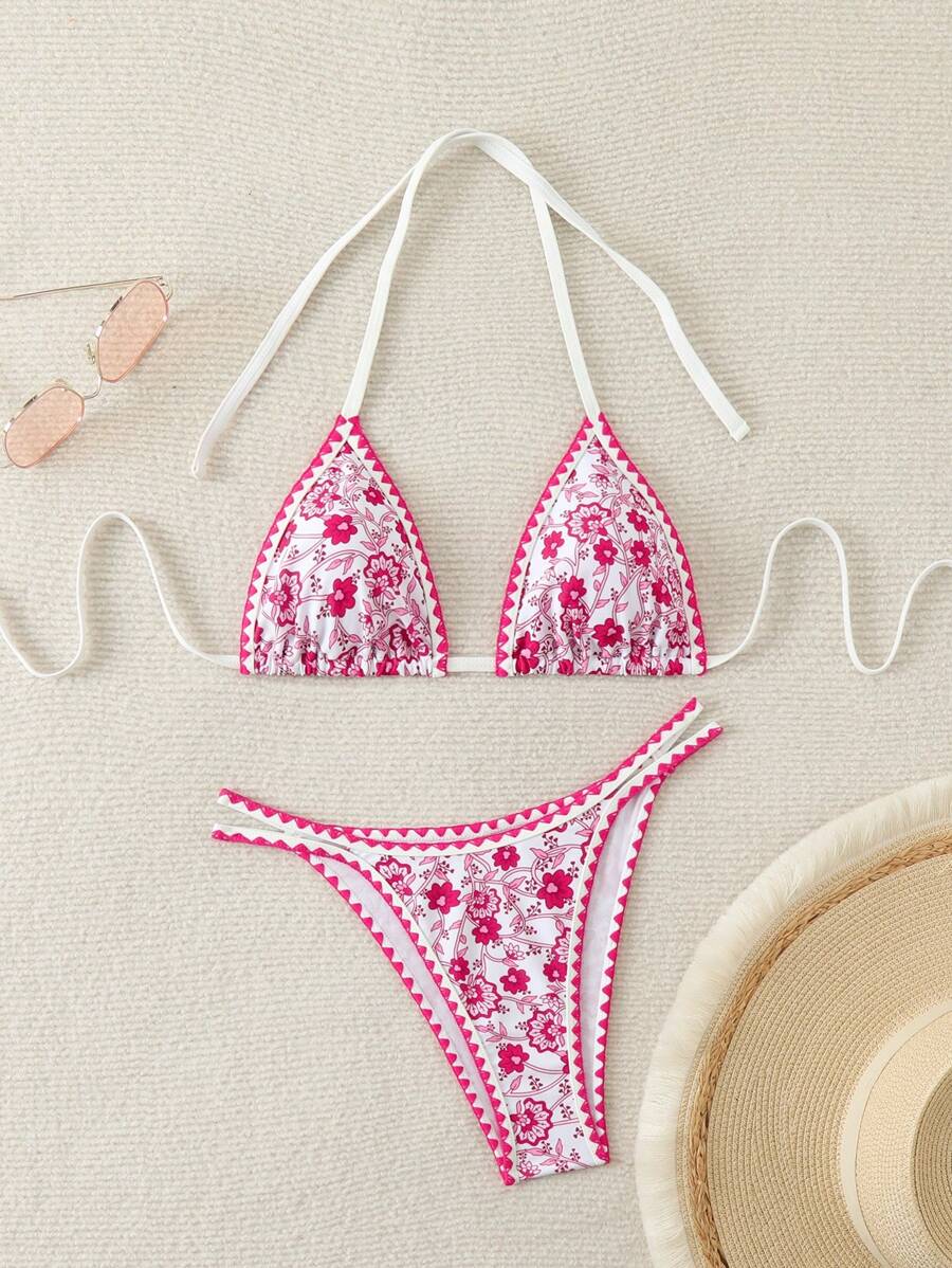 SHEIN Swim Conjunto De Bikini De Moda Para Mujer Con Estampado Floral Cuello Halter Lazo Y is a popular picture for sexy and hot.