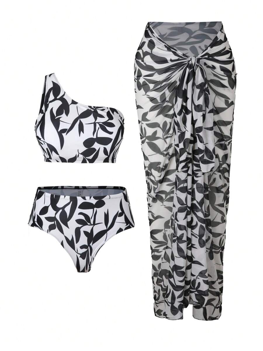 SHEIN Swim Curve Plus Size Women Floral Print One Shoulder Bikini Set With Sarong And Skirt 57148