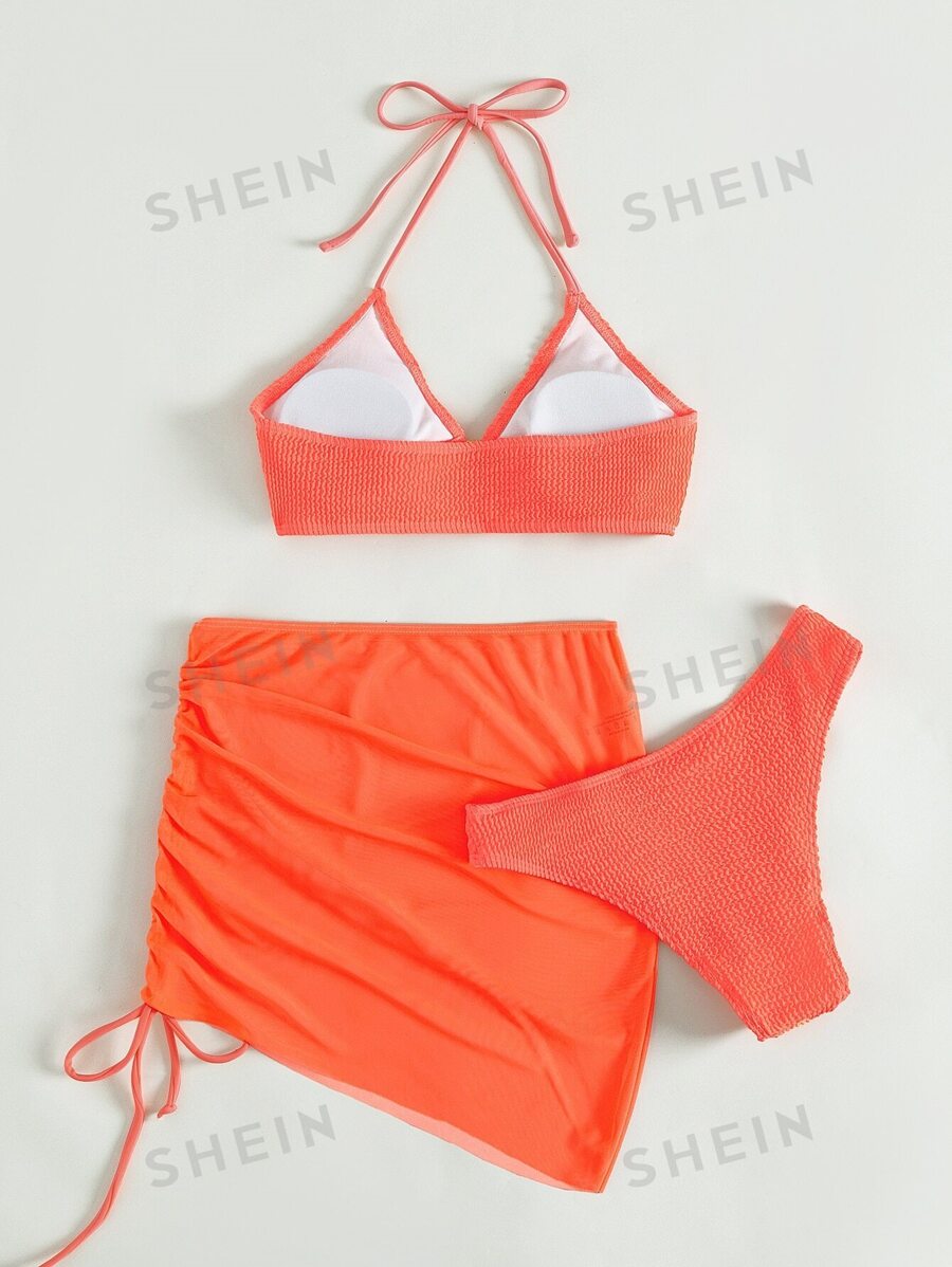 SHEIN Swim Ensemble bikini texturé à lien anneau triangulaire soutien gorge Bas Jupe cache 186576