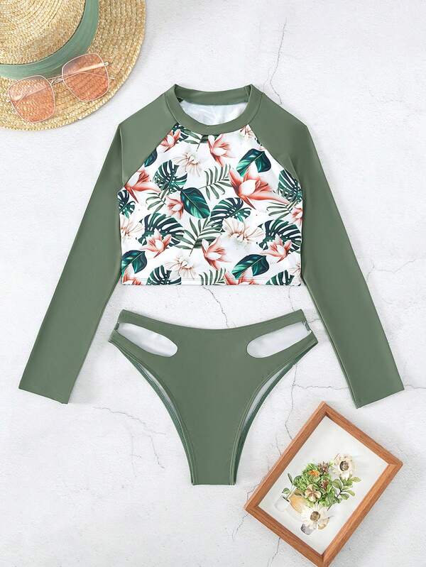 Tag : SHEIN Swim SERF Bañador bikini con estampado tropical con abertura de cuello cisne Moda de