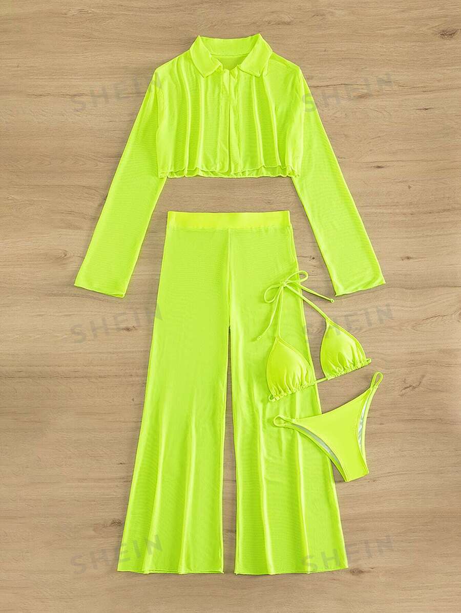 Tag : SHEIN Swim Vcay Summer Beach Sheer Bikini Set Halter Triangle Bra Thong Cover Up Shirt