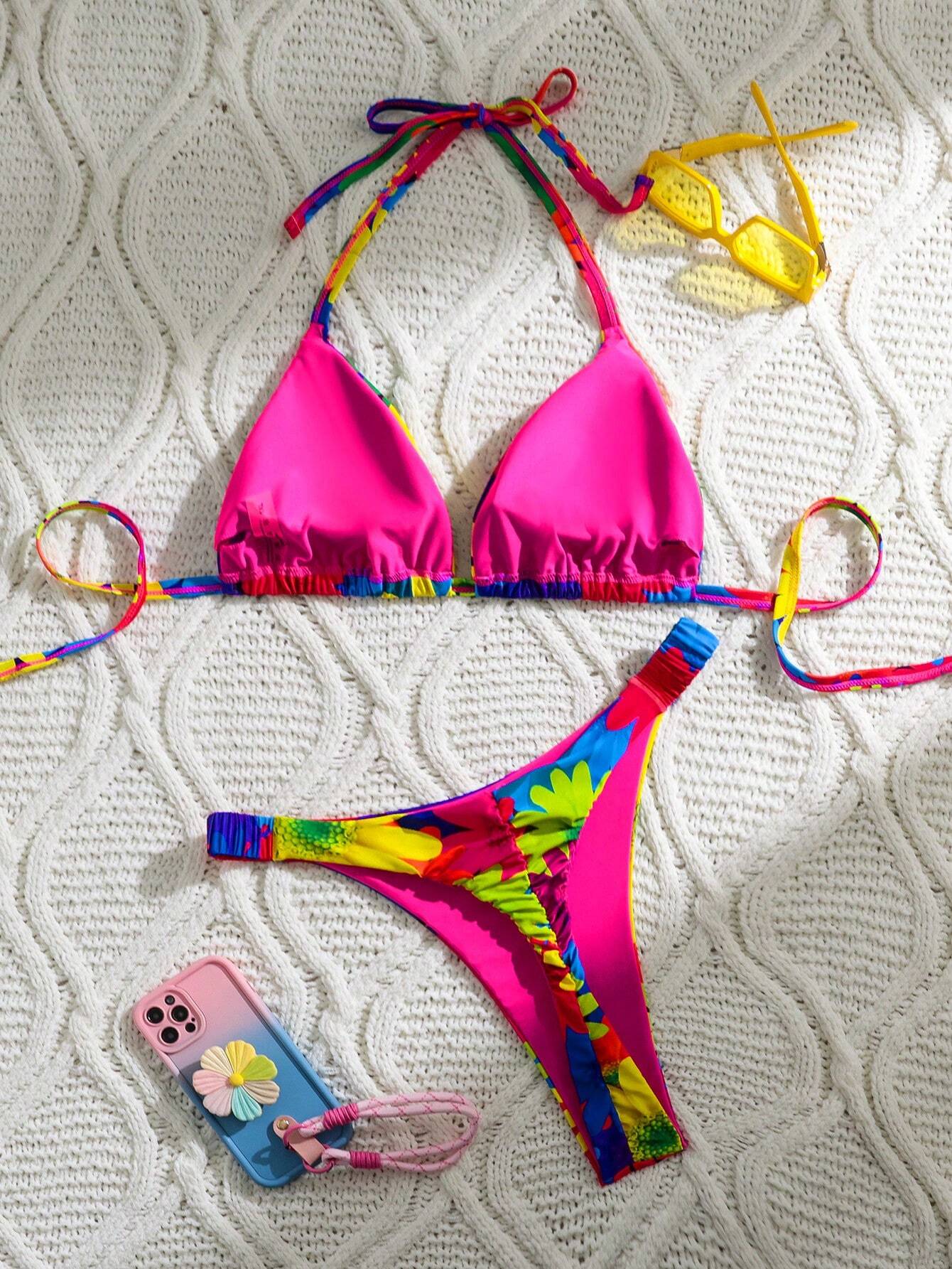 Tag : SHEIN VCAY Summer Beach Plus Size Women S Vacation Floral Print Halter Tie Sexy Bikini Set