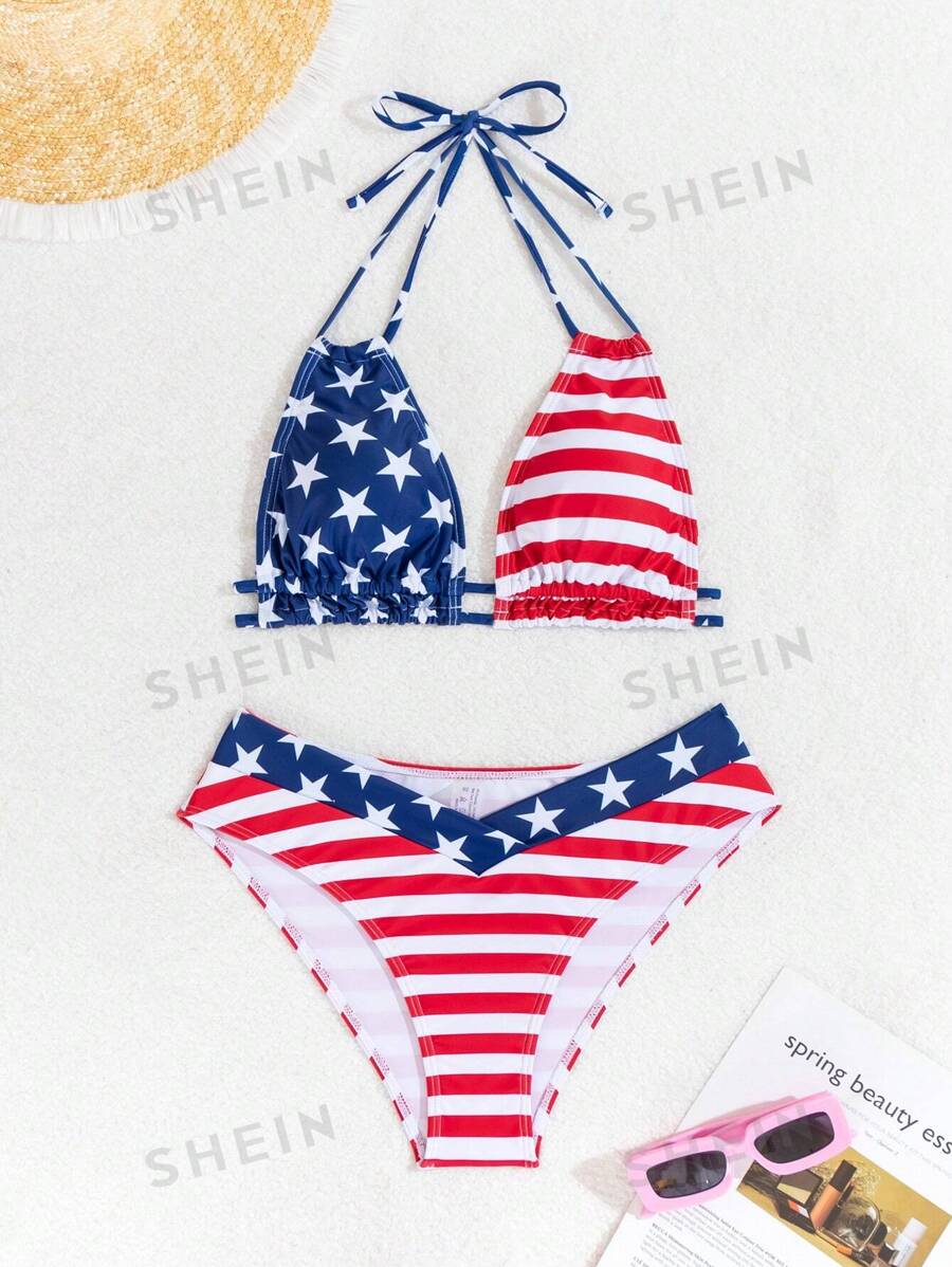 Tag : SHEIN VCAY Women S Beach Vacation American Flag Print Halter Neck Bra Bikini Bottom Two Piece