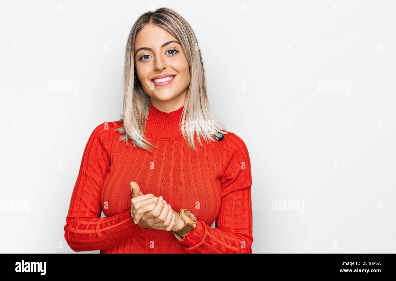 Schöne blonde Frau trägt Casual Kleidung mit Händen zusammen und gekreuzte Finger lächelt is a popular picture for sexy and hot.