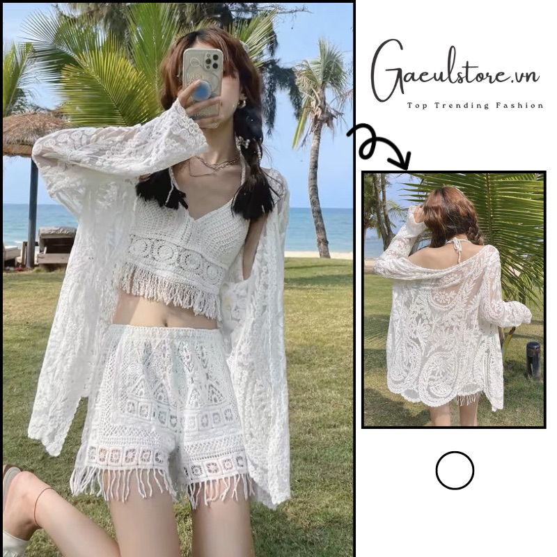 Set ren đi biển bikini mảnh len móc sang chảnh cho nữ áo bra tua rua kèm khoác và quần sooc
