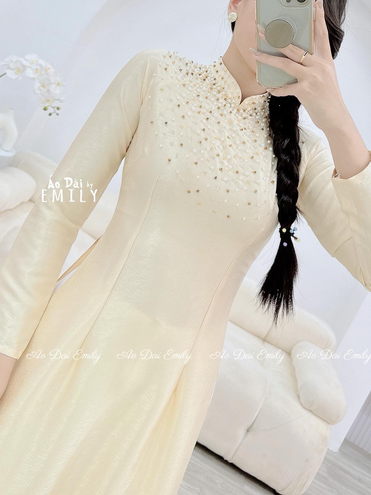 Simple Nude Ao Dai With Crystal Rhinestones áo Dài Vietnam No Pants Ao Dai Women Uniform Ao Dai