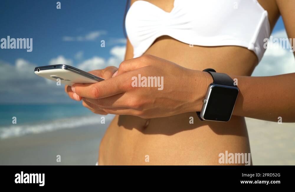 Smartwatch And Smart Phone On Beach Woman In Bikini Using Wearable Tech Stock Video Footage is a popular picture for sexy and hot.