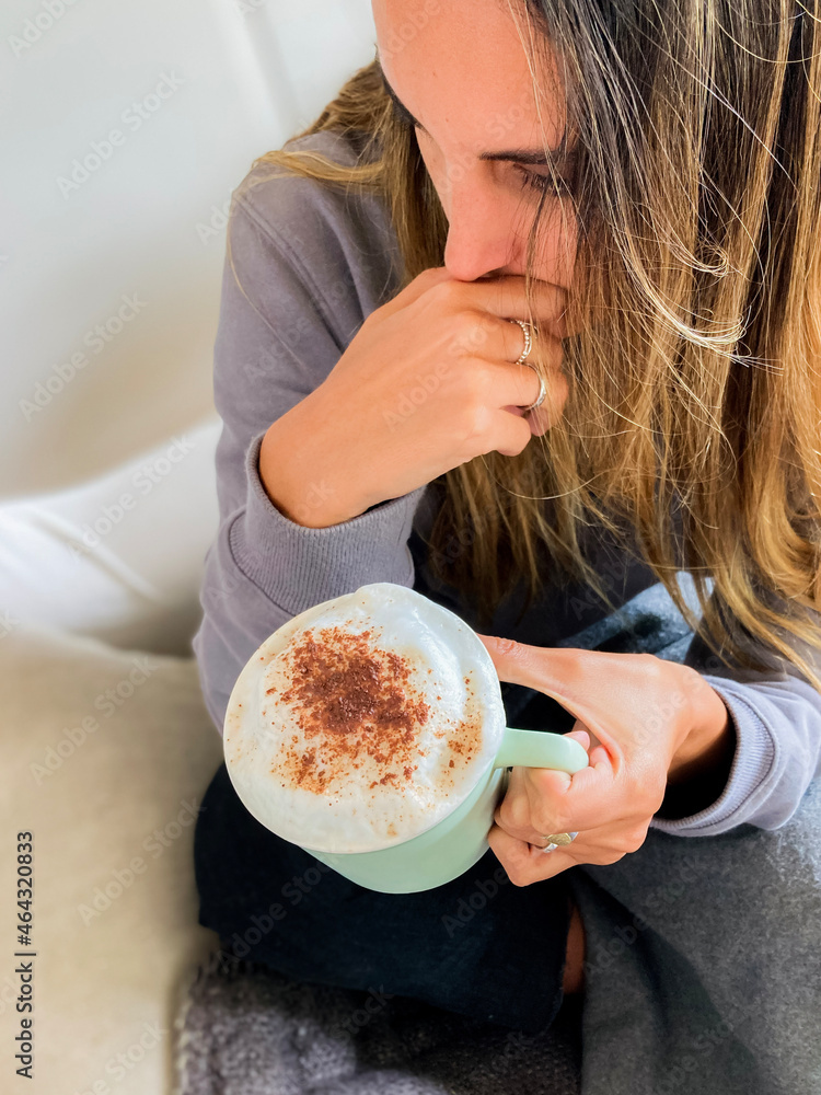 Stockfoto Niña latina tomando una taza de chocolate o café caliente y muy espumoso lleva 339570