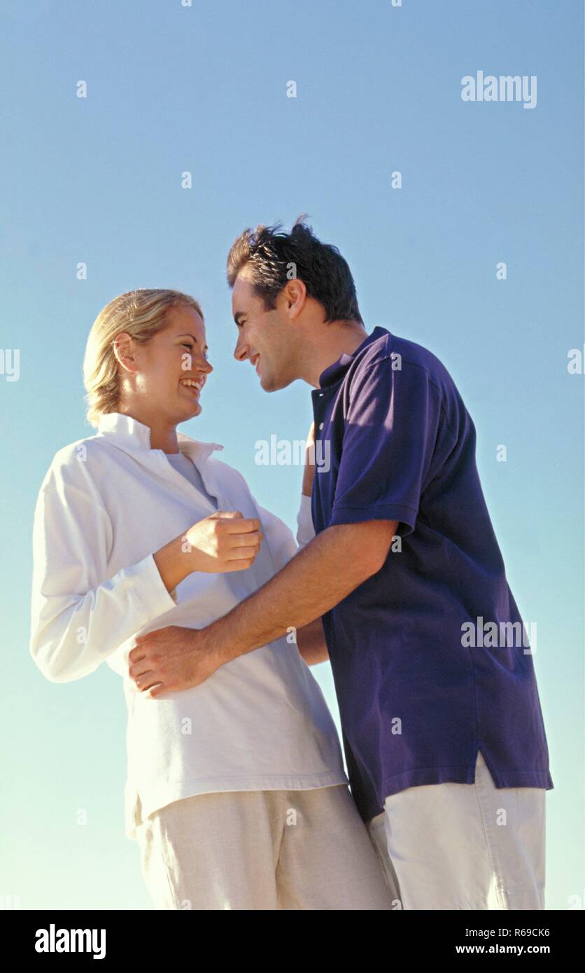 Tag : Strandszene Halbfigur Lachendes Paar In Inniger Umarmung Bei Strahlend Blauem Himmel Blonde